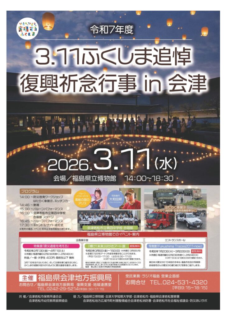 3.11ふくしま追悼復興記念行事in会津 イベント 2026.03.09 ■3月11日(水)14:00~18:30 「令和7年度 3.11ふくしま追悼復興記念行事in会津」が 福島県立博物館において開催されます。 防災啓発ワークショップに続き 午後2時45分より黙祷が行われます。 問合せ:福島県会津地方振興局 0242-29-5214